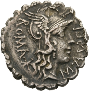 Rückseite: S . CAVR[I] // L . LIC . CN . [DOM] (AVR ligiert). Nackter, bärtiger Krieger in Biga nach rechts, hält Schild und carnyx in einer, Zügel in der anderen Hand